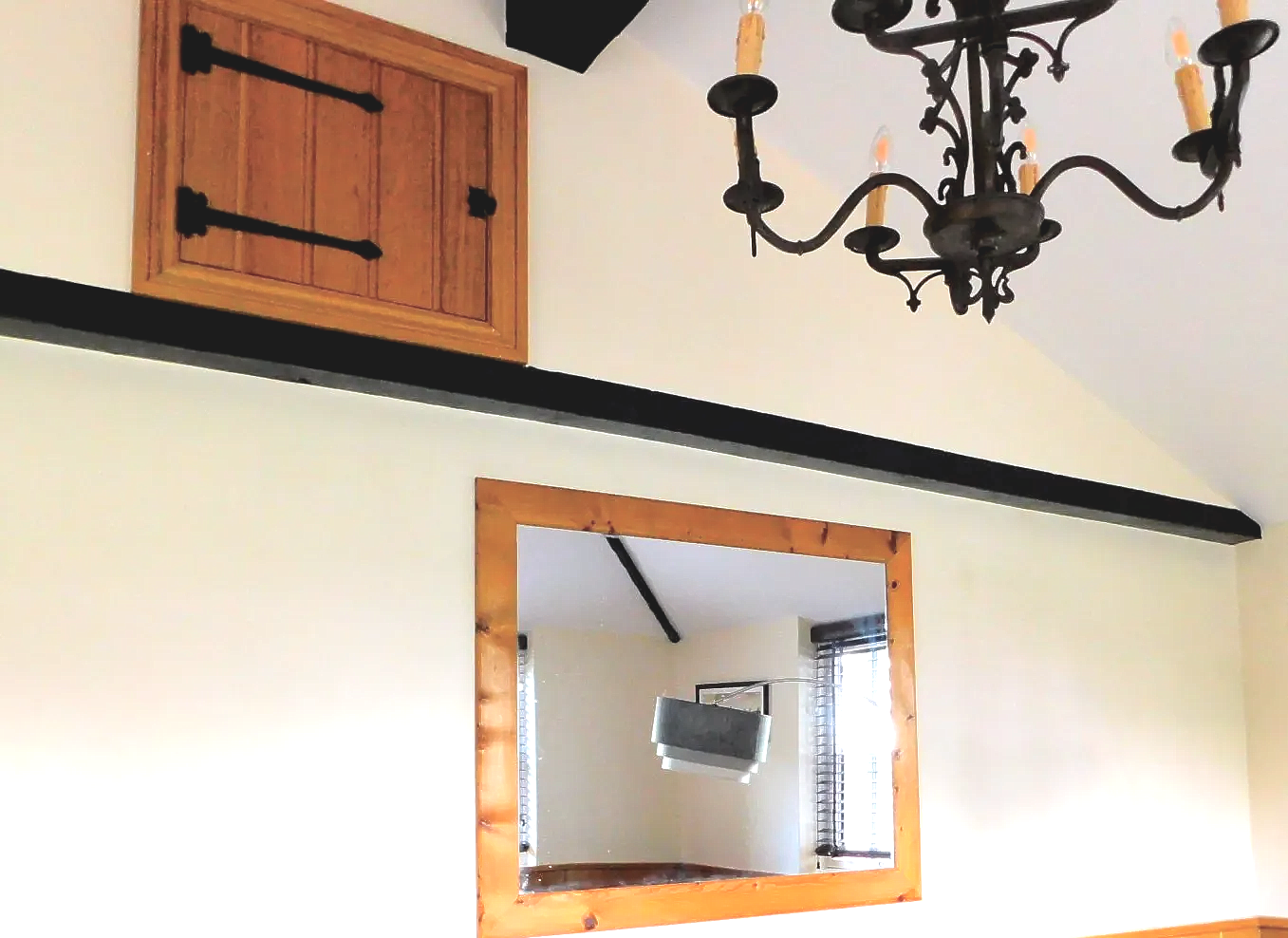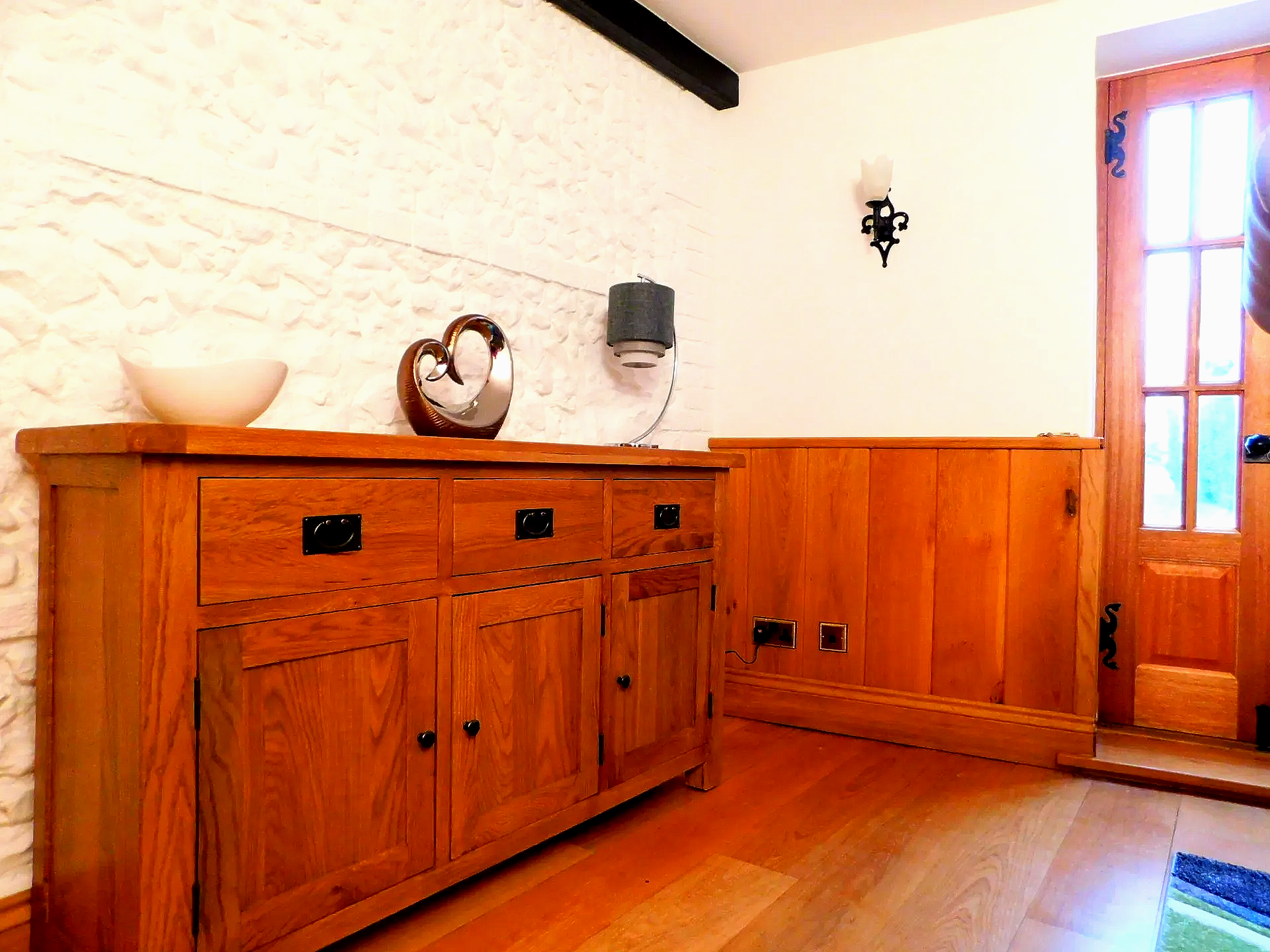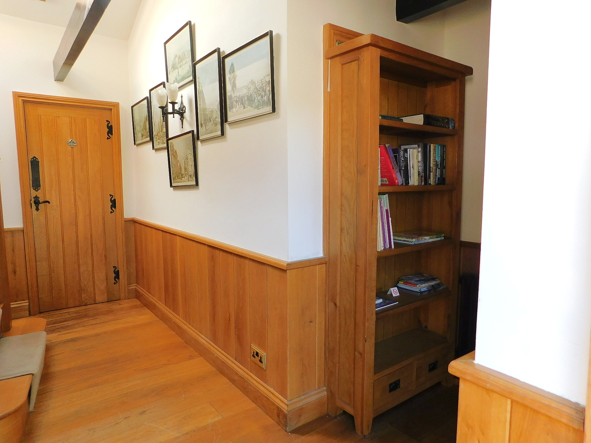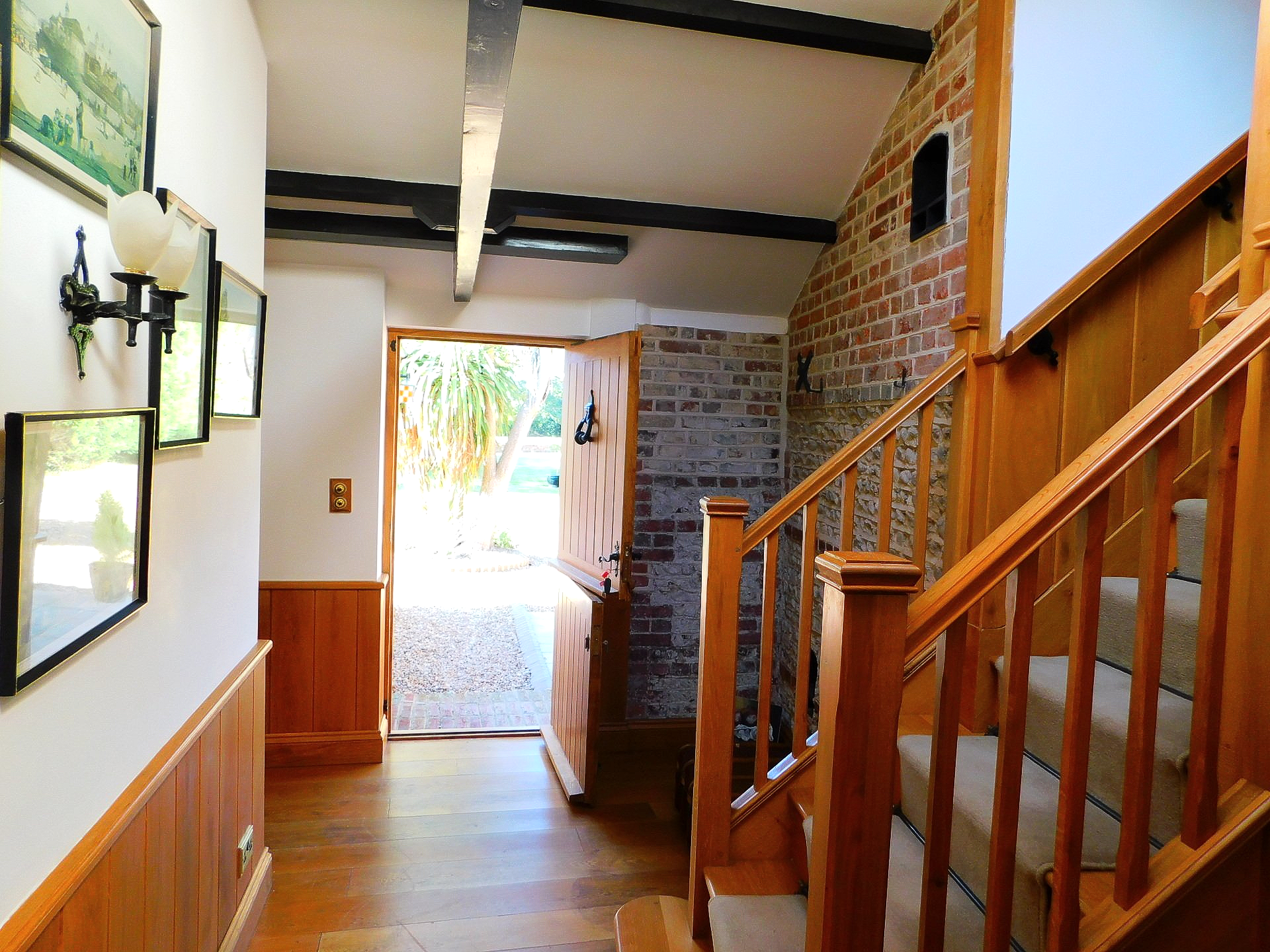The Entrance Hall has a vaulted ceiling with exposed beams, the wood paneling on the walls complements the exposed flint feature wall. The downstairs cloakroom once again is fitted with period Burlington fixtures.