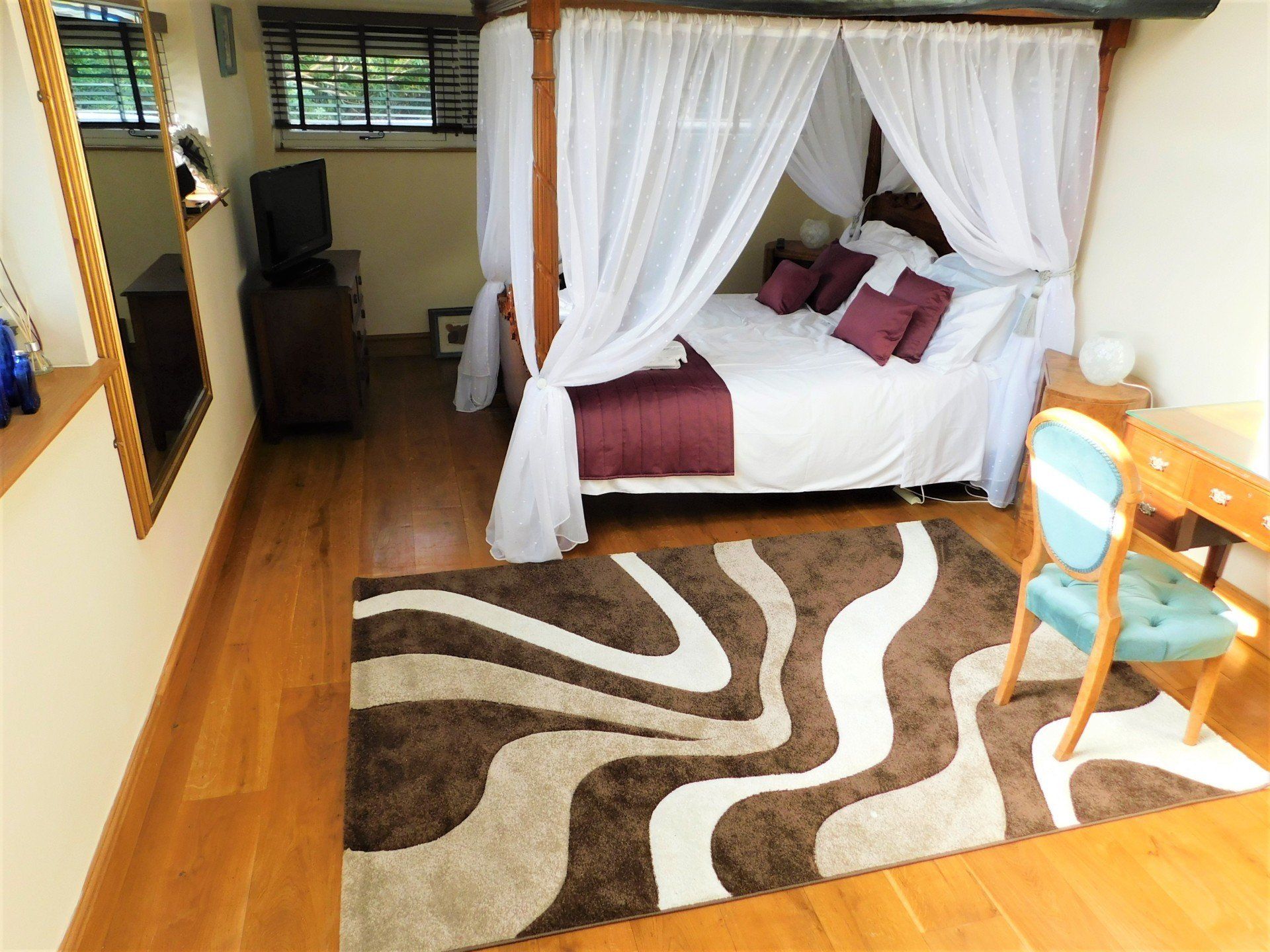 On the first floor and converted from what originally was the apple loft, the Master Suite is a wonderful space. With original beams a prominent feature the suite has windows on all sides and large skylights which give lots of natural light, albeit all are fitted with blinds for when you don't want the daylight. The four poster bed rightly takes center stage but there are other attractions to this large room. The adjacent 'en suite' has a Burlington suite fitted with all of the period features including a slipper bath.