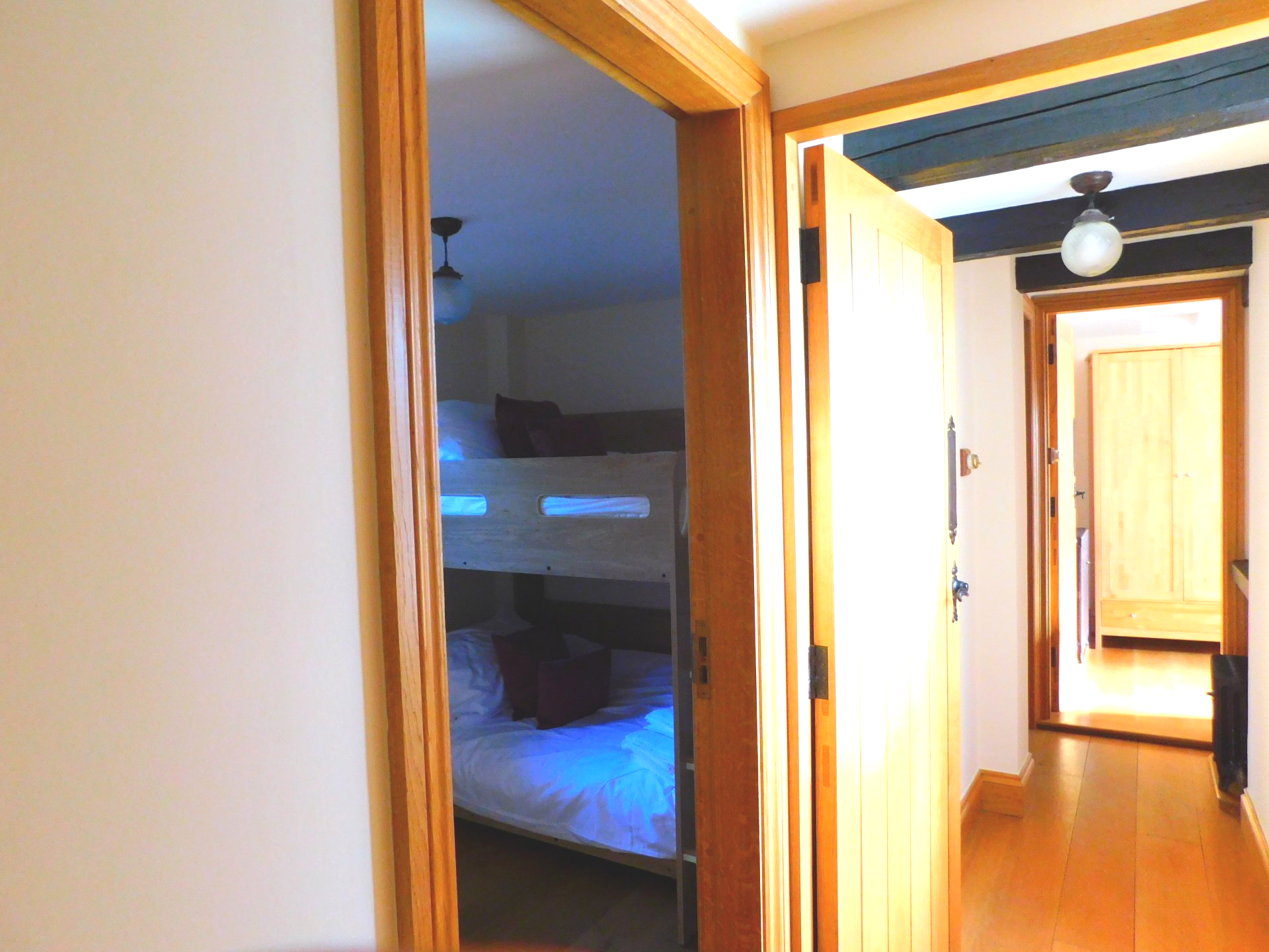 The Apple Loft has a spacious lounge and a separate dining room, with French doors onto the patio area. The compact but well equipped kitchen/utility enables you to self cater as much as you would like during your stay, alternatively you can take advantage of the many fine restaurants and 'eateries' that the local area has to offer (please see the Eating Out page). There are two downstairs bedrooms, one double and one fitted with bunk beds (the Sky bunks are full size single beds and offer great comfort even for larger adults). The family bathroom is located between the two downstairs bedrooms and has a walk in shower as well as a feature 'slipper' bath, for those who prefer to 'soak'. The downstairs is completed with a separate cloakroom adjacent to the lounge and dining room. Upstairs is the luxury Master Suite with many period features, including a four poster bed. The large bedroom is complemented by an 'en suite' which again has both a shower and 'slipper' bath.