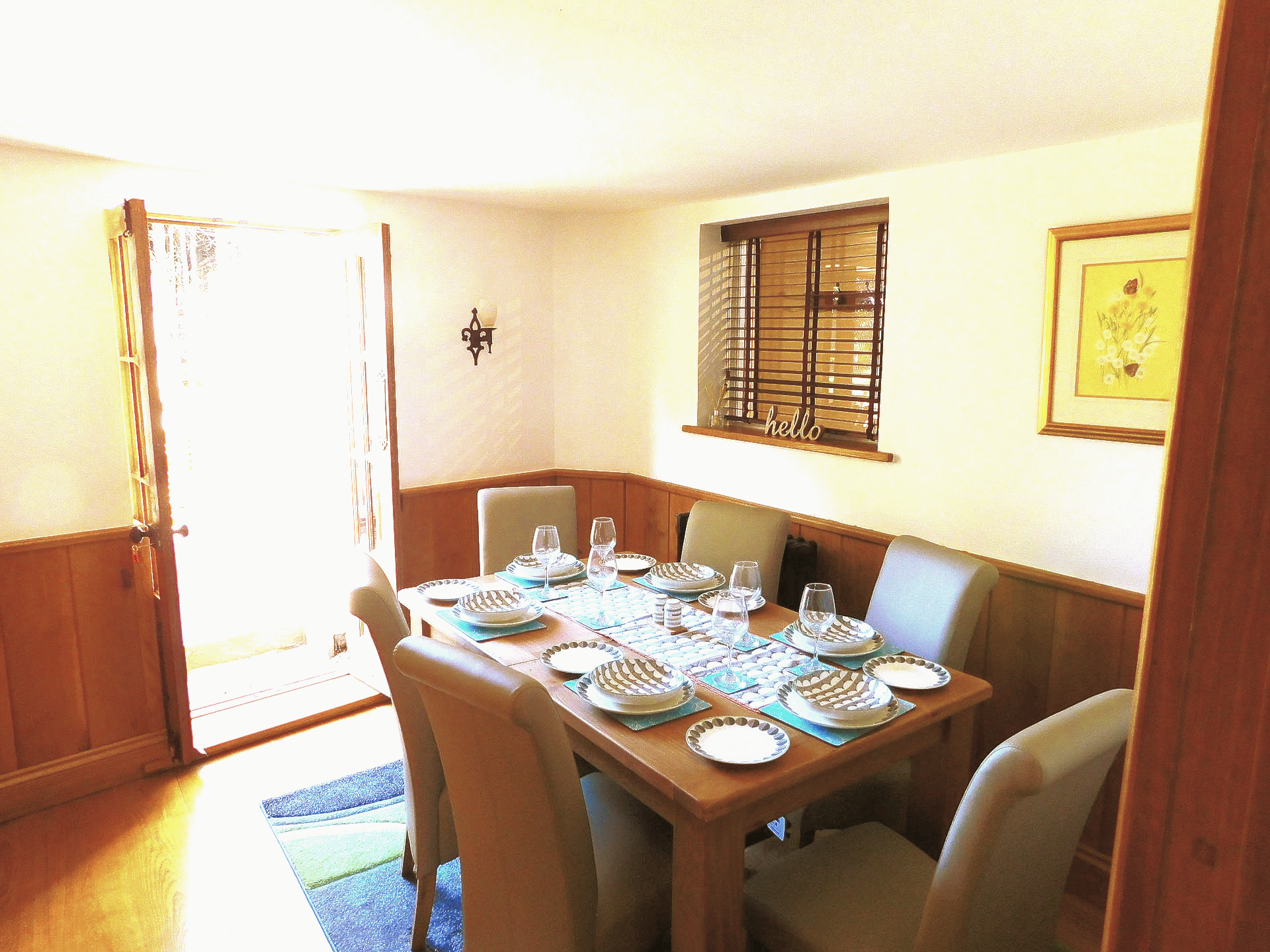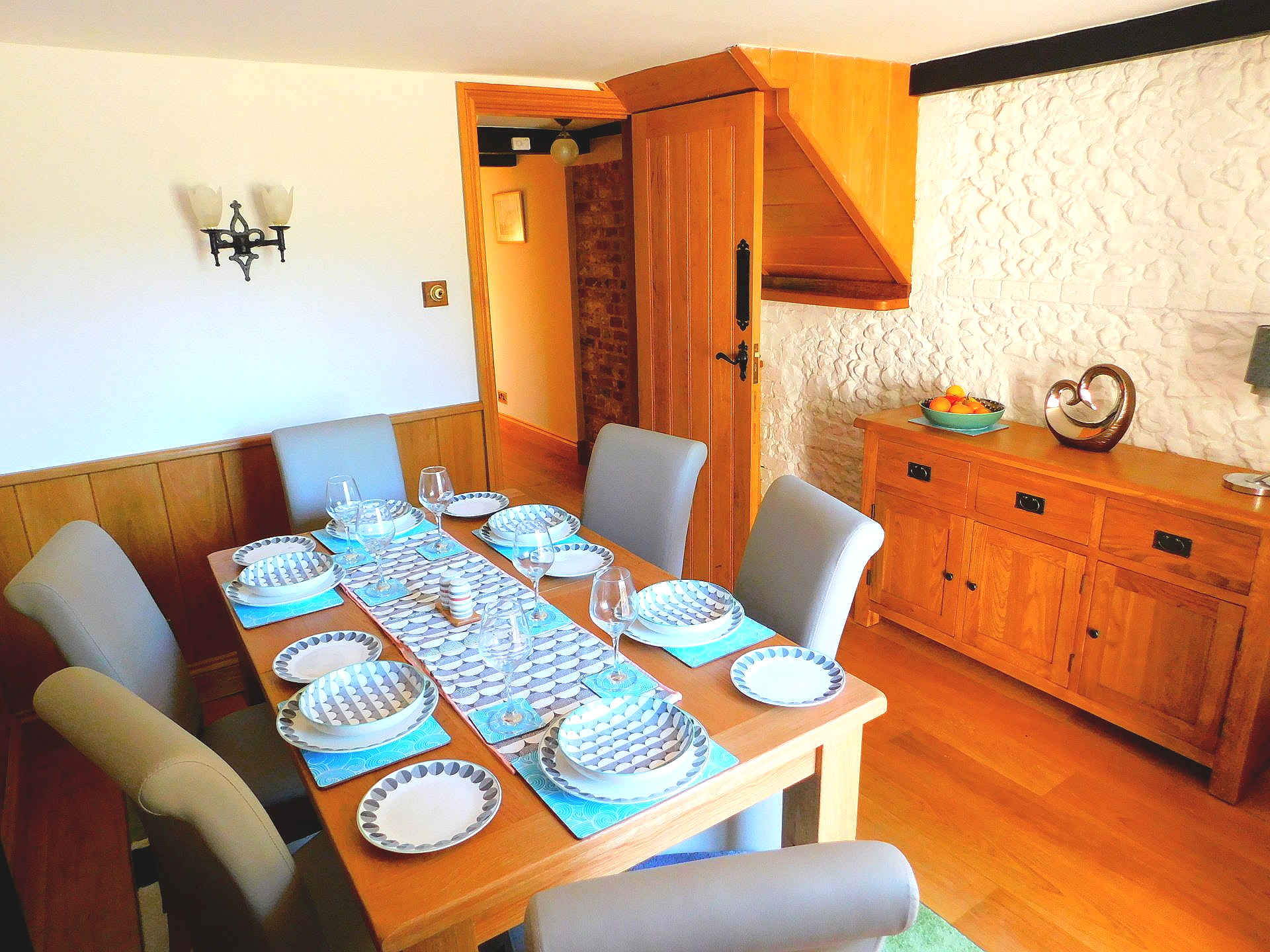 Situated adjacent to the kitchen for easy serving, this is a lovely feature room with oak wall paneling and period features. French doors lead onto the patio in case you prefer 'al fresco' dining. The oak dining table seats six comfortably, an additional high chair and/or children's dining chair are available for younger guests.